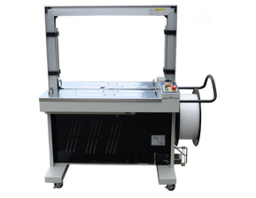 ? 全自动打包机?MH-101A(自动捆扎机)可以实现自动打包,但因为台面无动力,所以需要人工推一下包装物品才能通过打包机。这款全自动打包机使用打包带缠绕产品或包装件,然后收紧并将两端通过热熔连接。